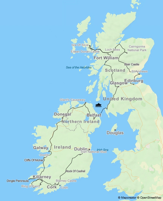 - Dublin, Kinsale, Killarney, Galway, Glasgow, and Edinburgh